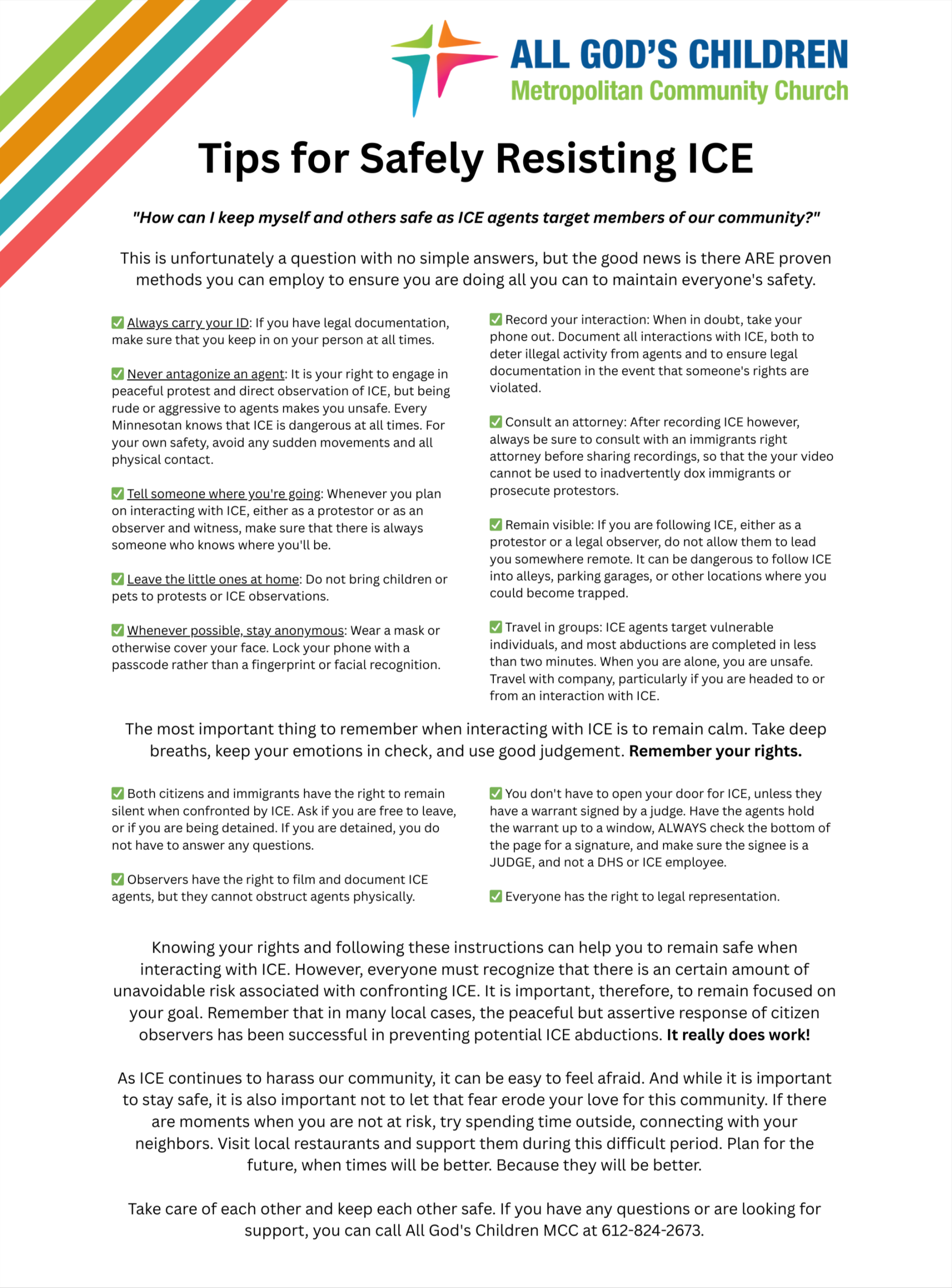 In the face of the escalating violence and terrorism of federal ICE agents continuing to spread throughout our community, All God’s Children MCC remains committed to supporting anyone that is afraid or vulnerable.